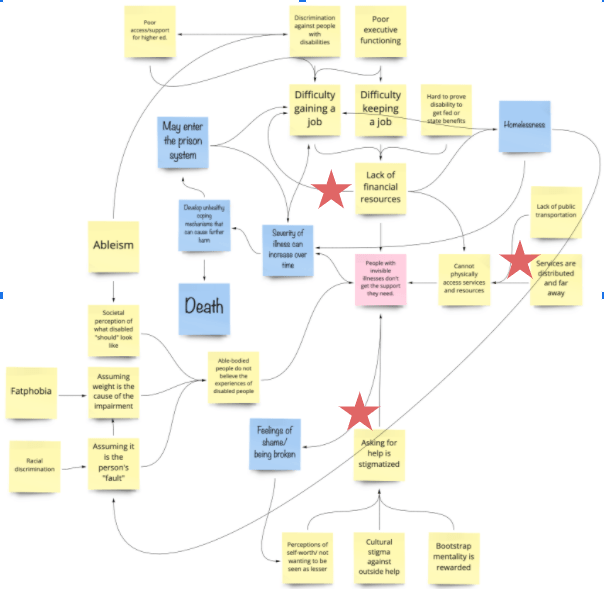 For example, if we want to address the lack of mental health support in our community, we have to think about the system surrounding that problem — cultural stigmas, physical and financial barriers, consequences within the educational system, federal and municipal priorities, etc. — to find an effective solution. By mapping out all of the factors that influence our original problem, we can see new opportunities for making changes with the biggest impact. In this example, we might design a solution to address cultural stigmas against seeing a therapist, or we might find ways to provide free transportation to services.
